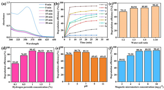 (a) UV-vis absorption spectra of tetracycline (TC) in the presence of magnetic micromotors with 1.0 wt% H2O2 and 5 × 10−3 M PMS at different time intervals. (b) Degradation efficiency of TC of different systems: (a) H2O2, (b) PMS, (c) magnetic micromotors, (d) KF@MnO2 micromotors + H2O2, (e) KF@MnO2 micromotors + PMS, (f) KF@MnO2 micromotors + H2O2 + PMS, (g) MnFe2O4 NPs + H2O2 + PMS, (h) magnetic micromotors + H2O2 + PMS. (c) The effect of water–soil ratio on TC degradation efficiency. (d) The effect of H2O2 concentration on TC degradation efficiency. (e) The effect of pH on TC degradation efficiency. (f) The effect of magnetic micromotor concentration on TC degradation efficiency.