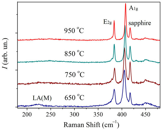 In Figure 3 the Raman spectra of the first series of MoS2 samples are presented. The spectra contain first-order peaks denoted as E2g1 (Γ) and A1g (Γ) corresponding to oscillatory modes inside the S-Mo-S layer in the parallel and perpendicular directions. The spectrum of the sample synthesized at 650 °C additionally demonstrates a broad LA(M) peak at about 227 cm−1 which is sensitive to lattice defects [42,43,44]. Previously, a correlation was established between the relative intensity of this peak and the density of both radiation-induced point defects [42], and grain boundaries [43,44]. This peak indicates a higher concentration of defects in this sample.