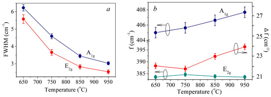 In Figure 4a Full Width-Half Maximum (FWHM) temperature plot for the E2g1 and A1g peaks is provided. For both peaks, the FWHM decreases monotonically with increasing temperature. A sharper decrease is observed in the temperature range 650–850 °C. In this range, the decrease in FWHM is presumably associated with an increase in the crystallite size. However, in the range of 850–950 °C, the average crystallite size decreases. Therefore, the persistence of the trend towards a FWHM decrease should be associated with an improvement in the crystal structure quality.