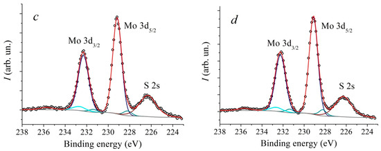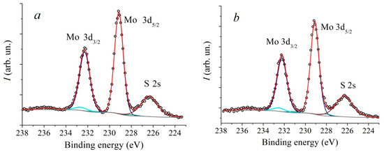 Raman spectroscopy is one of the most widely used methods for MoS2 crystal structure investigation. The MoS2 structure quality is estimated based on the E2g1 и A1g peaks width, as well as specific peaks, corresponding to the lattice defects. Thus, in [36] it was found that with increasing temperature, the Full Width-Half Maximum (FWHM) of E2g1 peaks decreases from 4.7 ± 0.1 to 3.2 ± 0.3 (cm−1), and the FWHM of A1g peaks decreases from 5.6 ± 0.1 to 4.5 ± 0.5 (cm−1). The XPS method is used to estimate the deviation of the film’s stoichiometry. Thus, using XPS in [37] the authors established that the S:Mo ratio depends on the process temperature, substrate material, and plasma power during substrate pretreatment.