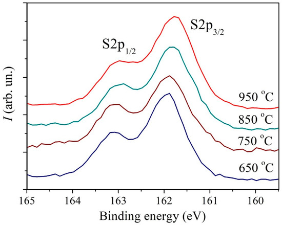 XPS core level S2p spectra of MoS2 samples deposited at different temperatures.