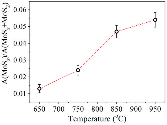 Temperature dependence of the relative concentration of non-stoichiometric MoSx compound estimated from XPS spectra.