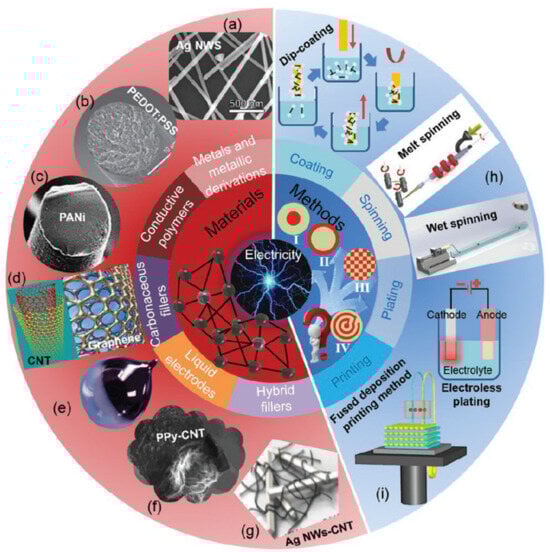 Various conductive materials are used for fiber-based nanogenerators including metals, polymers, carbonaceous fillers, liquid electrodes, and hybrid fillers (Figure 1) []. Metals are widely used in multiple ways due to their advantages such as high electrical conductivity and excellent mechanical properties. However, it is difficult to use metals for large-scale applications due to their disadvantages, including heavy weight and large volume. Recently, metals have been used in wearable electronics in the form of nanoparticles (NPs), nanowires (NWs), nanosheets, etc. Especially, a lot of metal nanowires including copper nanowires (Cu NWs), gold nanowires (Au NWs), and silver nanowires (Ag NWs) have been reported due to their high electrical conductivity, thermal conductivity, optical properties, etc. Moreover, conductive polymers are used in various fields due to their light weight, corrosion resistance, excellent mechanical properties, etc. There have been a lot of conductive polymers including polyaniline (PANI), polypyrrole (PPy), polythiophene (PTh), etc. Especially, poly(3,4-ethylenedioxythiophene):polystyrene sulfonate (PEDOT:PSS) is promising material due to its great thermal stability, environmental stability, high electrical conductivity, etc. Furthermore, a lot of carbonaceous fillers have been reported including carbon black (CB), carbon nanotubes (CNT), graphene oxide (GO), etc. Among the carbonaceous fillers, CNTs and graphene are widely used in wearable electronics as electrode materials. Materials and fabrication processes must be appropriately selected based on their purpose and applications.