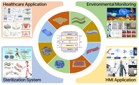 Various fibrous materials and functional fibers have been studied for practical applications such as acoustic, tactile, and motion sensors, gas detection, and physiological monitoring []. Smart fiber- and textile-based TENGs (f/t-TENGs) have been summarized and discussed by Prof. Wang’s group []. TENGs are used for energy generation and self-powered monitoring systems, and f/t-TENGs are used in the same way. For a higher output performance in f/t-TENGs, functional materials can be embedded in fibrous materials [,,,]. In addition, functional fiber-based TENGs are now used in biomedical applications such as pulse wave, respiration, and human motion monitoring, as well as quantitative analysis [,,,]. Here, we review recent advances in functional fiber-based wearable triboelectric nanogenerators (FF-WTENGs) in the context of healthcare applications, environmental monitoring, sterilization systems, and human–machine interface (HMI) applications (Figure 2).