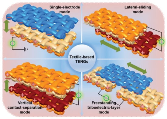 The four operation modes of textile−based TENGs, which take the fabric−based TENGs as examples. The yellow models refer to conductive fabrics, while the gray, crimson, and blue models represent dielectric fabrics. Reprinted with permission from Ref. []. Copyright 2019 John Wiley & Sons.