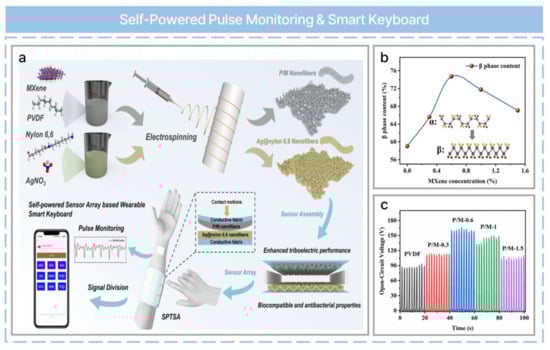 A biocompatible and antibacterial all−textile structured triboelectric nanogenerator for a self−powered tactile sensing apparatus (SPTSA). (a) Schematic of the fabrication and application of the SPTSA. (b) The β-phase content of the P/M nanofibers. (c) The open-circuit voltage variations of different P/M nanofibers. Reprinted with permission from Ref. []. Copyright 2023 Elsevier.