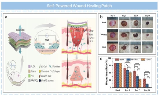 Wound healing, while essential for personalized healthcare management, is a complex and dynamic physiological process []. Nonhealing wounds can lead to complications such as metabolic disorders, immune imbalances, and even life-threatening diseases. Patch-type applications for wound healing are used but are limited by power supplies or antibiotics. A self-powered wound-healing patch can be fabricated with a functional fiber-based TENG (Figure 5a) []. Polycaprolactone (PCL) and poly(lactic-co-glycolic acid) membranes can be prepared for a wound healing patch via electrospinning. Polypyrrole (PPY) is coated onto another electrospun PCL membrane via chemical vapor deposition. Then, three membranes are assembled into a sandwich structure device, which functions as a single-electrode-mode TENG. This has exhibited outstanding antibacterial properties and satisfied the physical requirements for a wound-healing patch, including flexibility, breathability, and wettability. Electrical stimulation from the TENGs and positive charges on the PPY surface effectively kill bacteria. Moreover, the antibacterial property can be explained in terms of the electrostatic interaction between PPY molecules and bacterial cells. The in vivo performance was evaluated by healing infected wounds in diabetic rats. The wound-healing TENG patch achieved superior healing compared with control groups (Figure 5b), and the patch showed excellent wound-healing performance compared to the control groups, completely healing up to 14 days after surgery (Figure 5c).