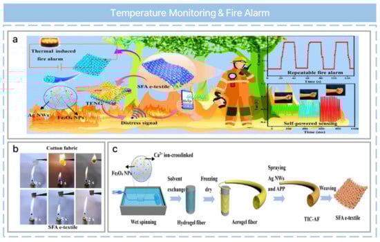 Ultralight self−powered fire alarm e−textile based on a conductive aerogel fiber with repeatable temperature monitoring performance used in firefighting clothing. (a) Applications of the SFA e−textile in smart firefighting clothing for energy harvesting, real−time fire warning, and precise rescue location. (b) Vertical burning test processes of the SFA e−textile under an alcohol lamp flame. (c) Schematic description of the fabrication of the TIC−AF and SFA e−textile. Reprinted with permission from Ref. []. Copyright 2022 American Chemical Society.