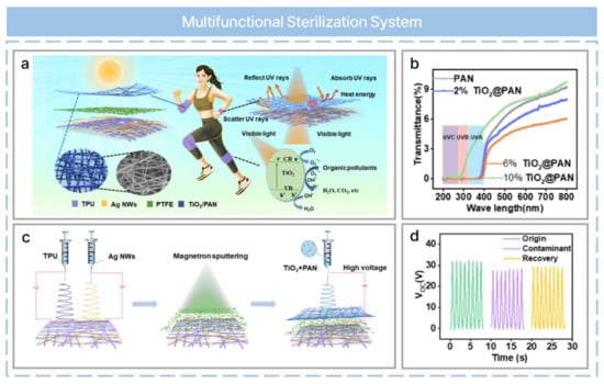 Multifunctional wearable electronics and TENG-based wearable electronics can be applied to various functions. For example, an ultraviolet (UV)-protective, self-cleaning, antibacterial nanofiber-based TENG has been reported, as shown in Figure 9a []. Titanium dioxide (TiO2) is known for its UV resistance, stability, and lack of toxicity. However, the content of TiO2 was selected based on UV transmittance, absorption, and its protective performance and mechanical properties, as shown in Figure 9b. TiO2 and polyacrylonitrile (PAN) can be used to fabricate nanofibers, which provide UV protection and electrification (Figure 9c). Thermoplastic polyurethane (TPU) and AgNWs are used to fabricate other nanofibers and serve as an electrode. PTFE is sputtered onto the middle film via magnetron sputtering technology for enhanced hydrophobicity. A multifunctional wearable TENG is composed of three parts: a TiO2@PAN nanofiber, PTFE, and TPU/AgNWs. Three fabrication procedures were compared in terms of UV protection: electrospinning PAN nanofibers and electrospraying TiO2 (TiO2/PAN); electrospinning PAN and coating with a pre-dispersed TiO2 NPs immersion (TiO2-PAN); and electrospinning of a solution based on TiO2 and PAN (TiO2 + PAN). As a result, TiO2 + PAN nanofibers from one-step electrospinning achieved the best UV protective properties considering the UV protection factor, transmittance of UVA, and transmittance of UVB. Silver and TiO2 are anti-microbial agents with a wide range of biocidal properties. When the anti-bacterial performance was evaluated, TiO2/Ag NW/PAN nanofibers demonstrated the best anti-bacterial properties compared with the control groups due to the free radicals from TiO2 and rapidly released silver ions. Furthermore, TiO2 can be used for self-cleaning under UV light as it is a semiconductor material. The electrical output recovery was evaluated when polluted by organic contaminants (Figure 9d). Samples containing TiO2 recovered to near-original values.