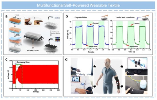 A humidity−resistant, stretchable, and wearable textile−based triboelectric nanogenerator for mechanical energy harvesting and multifunctional self−powered haptic sensing. (a) Fabrication process of PFL@WFCF−TENG. (b) Comparison of the sensing performance of PFL@WFCF−TENG on finger touching between dry and wet conditions. (c) The output signal recovery process curve of the t-TENG after spray dampness adopts triboelectric layers’ PFL. (d) Schematic multi−functional HMI systems based on wearable haptic controllers such as controlling light switch states, electronic badges, slides, and humidifiers. Reprinted with permission from Ref. []. Copyright 2021 Elsevier.