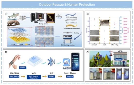 Outdoor accidents can lead to severe injury or even death, and requesting a rescue at the right time can mitigate dangerous situations. Wearable or portable devices can be used to request a rescue in an emergency, and it is possible to manufacture battery-free, self-powered wearable electronics using a fabric-based TENG []. A bionic-scale knitting triboelectric nanogenerator (BSK-TENG) can be fabricated using a knitting technique based on a high-speed V-bed flat knitting machine with three types of yarns (Figure 11a). PTFE yarn is used as a tribo-negative material that is hydrophobic. Nylon yarn is a widely used textile materials due to its strong abrasion resistance and low price. Silver-plated nylon yarn is used as a conductive material due to its soft feel and low electrical resistance. A BSK-TENG operates in a single-electrode mode, and the electrical performance can be optimized with knitting parameters (vertical scales, horizontal distance between scales, width and length of scales, and scale layout). The mechanical properties, washability, breathability, and durability of BSK-TENGs have been investigated. When the electrical output was evaluated after washing in a laundry machine, the output performance recovered after one day (Figure 11b). Finally, integrating a BSK-TENG as a self-powered sensor with Bluetooth low-energy communication allows for practical applications (Figure 11c) in outdoor rescue systems with a wireless signal transmission (Figure 11d).