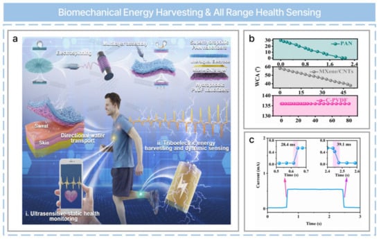 Electronic skin is a powerful technology for the monitoring of physiological signals and human movement. Moreover, it can be used in multiple ways in connection to HMI technologies. Recently, bio-inspired directional moisture-wicking electronic skin (DMWES) has been reported (Figure 12a) []. PVDF, carboxylated carbon nanotubes (CNTs), polyacrylonitrile (PAN), and MXene were used for fabrication through electrospinning and electrospraying. Carboxylic CNT–modified PVDF (C-PVDF) nanofibers were manufactured via electrospinning on aluminum foil. Afterward, MXene/CNT conductive ink was coated onto C-PVDF nanofibers via electrospraying. Finally, PAN nanofibers were electrospun onto C-PVDF/MXene-CNTs as a superhydrophilic outer protective layer. DMWES can be used for effective biomechanical energy harvesting and precise bioelectric signal sensing due to its unique structures. Figure 12b depicts the change in water contact angle over time. Only the C-PVDF layer achieved stable hydrophobicity, and this property was used for directional water transport. The electronic skin demonstrated a rapid response time (28.4 ms) and recovery time (39.1 ms) due to the characteristics of the C-PVDF layer (Figure 12c). Such a skin can be used for gait monitoring based on the single-electrode mode due to its pressure-sensing abilities. Precise human-pulse monitoring is also possible.