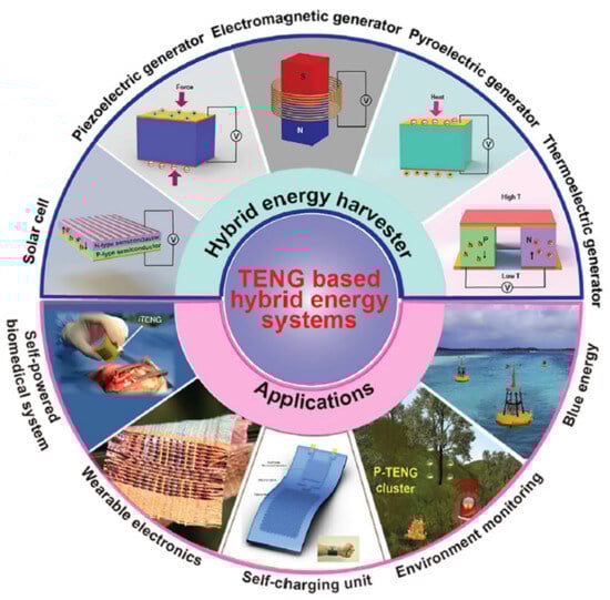 Triboelectric nanogenerators (TENGs) are promising energy harvesters and used in various fields. Moreover, TENGs can be utilized more widely by forming a hybrid system with other energy harvesters. There have been a lot of TENG-based hybrid devices for the enhancement of power density, utilization in various conditions, the use of various sources, etc. []. TENG-based hybrid harvesting systems are well organized by Prof. Cao’s group with respect to devices and applications (Figure 13) []. TENGs can be integrated with other energy harvesters such as a piezoelectric generator, electromagnetic generator, thermoelectric generator, etc. [,,,,].