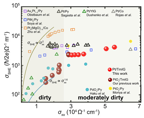 Since its first observation, the spin Hall effect (SHE) has been central in spintronics over the last decades [1,2,3]. Typically, in a heavy metal (HM)/magnet heterostructure, by applying a charge current in the HM layer, the SHE can generate a spin current in the perpendicular direction of the charge current [4,5,6,7,8,9,10,11]. The spin current is injected into the magnet, exerting spin torques that can control the magnetization of the magnet. Generally, the SHE originates from the extrinsic or the intrinsic mechanisms [3,12,13,14,15,16]. The contribution of the extrinsic scattering is induced by the spin-dependent scattering due to the impurities or defects in materials. On the other hand, the intrinsic contribution is induced by the Berry curvature and the band structure in the materials. Three different regimes were revealed in previous studies, which are superclean regime, moderately dirty regime and dirty regime [3,16]. Generally, the three regimes can be distinguished by the relationship between the spin Hall conductivity and electric conductivity : ∝. In the superclean regime, the extrinsic contribution is dominant due to that it is strongly diminished by the carrier scattering. The skew-scattering plays a key role and results in ∝. In the moderately dirty regime, the intrinsic contribution is dominant, and barely changes with since the carrier scattering time is sufficiently long [17]. While in the dirty regime, drastically decreases with , and the scaling exponent is typically larger than the unity since the carrier scattering time is short, which limits the interband excitation that governs the intrinsic SHE [18].