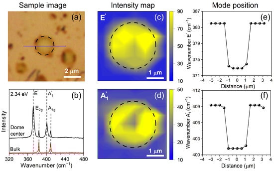 Figure 1c–f shows the intensity maps and positions of the dome peaks acquired with a laser energy of 2.34 eV. The intensity maps of the E and A1 Raman peaks indicate an increase in the modes intensities at the dome’s region compared with the bulk spectra, as displayed in Figure 1c,d, respectively. The positions of the E and A1 Raman peaks at the monolayer dome’s center are redshifted by about 11 cm−1 and 7 cm−1, respectively, when compared with the bulk’s positions, as shown in Figure 1e,f, respectively.