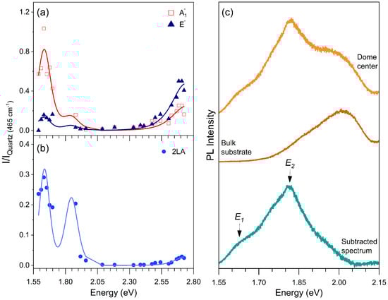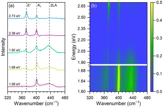 Figure 2b shows the result of a multiple excitation energy Raman map at the MoS2 dome’s center obtained using 23 different laser lines with excitation energies ranging from 1.59 to 2.73 eV. The peak intensities in Figure 2b were normalized by the intensity of the 465 cm Raman mode of quartz and are represented by the color bar. The intensity of the Raman spectrum of quartz has no dependence on the laser excitation energy since its band gap is in the UV range, around 8 eV [44,45] and, therefore, there is no resonance Raman effect in quartz in the visible range. The energies of the incident photons are on the vertical scale, and the horizontal scale represents the Raman shifts. The blank gap in excitation energies between 1.69 and 1.88 eV in Figure 2b is a region where we do not have available laser lines.