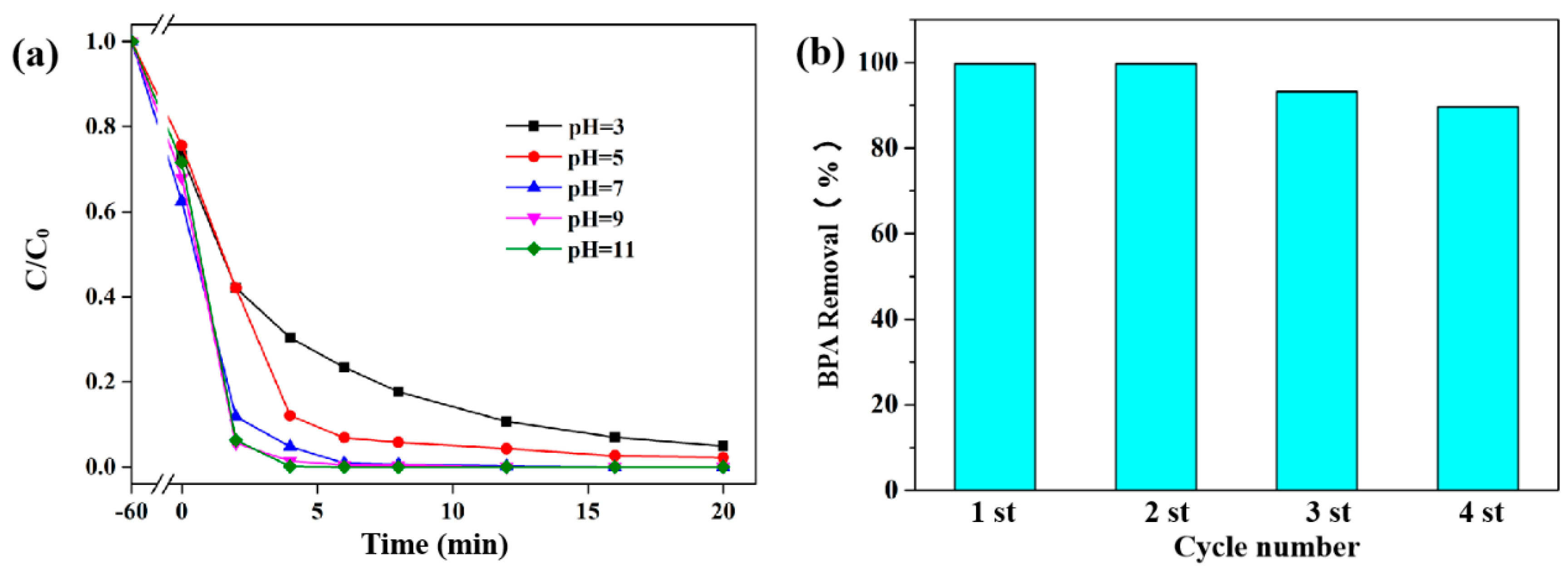 3.2. Adsorption and Catalytic Degradation of BPA Using Co/CCF