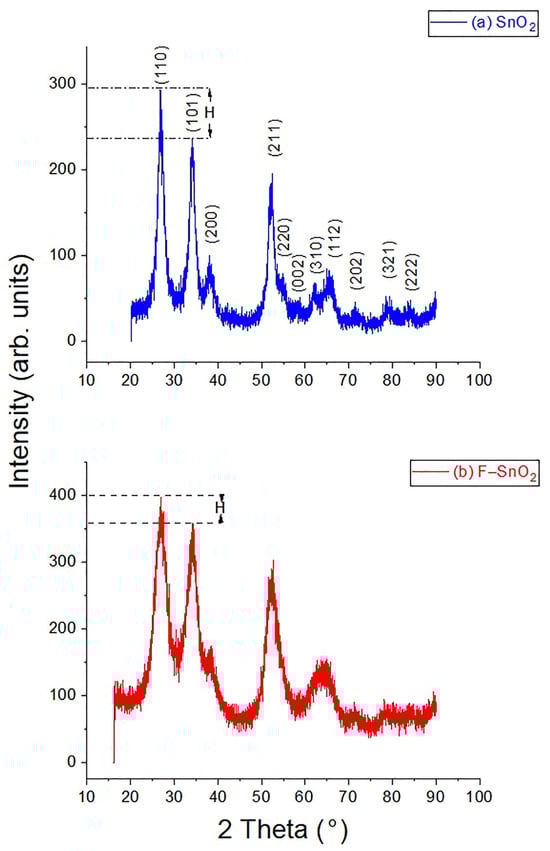 The wide-angle XRD patterns presented in Figure 2 show that both samples have a crystalline nature and that pure SnO2 was synthesized []. The diffraction peaks for both samples were indexed to the Cassiterite (tetragonal) structure of SnO2 [,]. No additional diffraction peaks appeared, indicating that the F species did not cluster or form a secondary phase outside the framework. This also confirms that the substitution of F ions did not affect the crystallinity of the material, [,] and that F ions were inserted into the framework []. Moreover, F– favors the (101) plane [,], which is why the intensity of this plane was relatively higher in relation to the (110) plane for F–SnO2 in comparison with these planes of SnO2. That is why the height difference (H) was relatively smaller in F–SnO2 than in SnO2, as presented in Figure 2a,b. This also confirms that F− is readily integrated in the framework of SnO2. Moreover, the (110) diffraction peak was used to calculate the average crystallite sizes for both samples by employing the Scherrer equation. The calculated average crystallite sizes were 4.1 and 3.4 nm for SnO2 and F–SnO2, respectively. The difference in the crystallite sizes agrees with and confirms the variation in the value of the unit cell a0 calculated in the low-angle XRD scan. These crystallite sizes confirm that SnO2 and F–SnO2 are both nanomaterials.