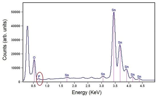 The EDX spectrum shows the K and L peaks of all the elements present in the F–SnO2 sample, in Figure 6, which reveals that the sample composition contained Sn, O, and F atoms. This confirms that F was successfully incorporated in the F–SnO2 sample and it was part of its composition. The circled peak in Figure 6 clearly shows the Kα peak of F at 0.67 keV, which was adjacent to the Kα O peak and had almost been masked by it. The bonds and the chemical composition of these elements would be determined using XPS.