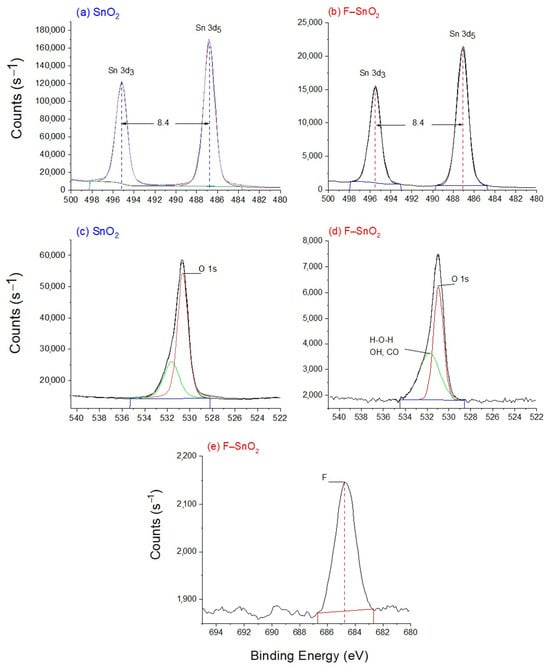 XPS analyses (Figure 7) were performed for both materials to investigate the surface and partial subsurface compositions and their oxidation states. XPS results in Figure 7a,b for both materials, SnO2 and F–SnO2, showed spin-orbit doublet peaks at 486.6 (Sn 3d5/2), 495.0 (Sn 3d3/2), and 487.1, 495.5 eV, respectively, plus 3d orbital splitting of 8.4 eV. This corresponded to the Sn4+ oxidation state of SnO2 [,]. The slight increment of 0.5 eV in the peaks of Sn 3d of the F–SnO2 sample could be attributed to the effect of the presence of the more electronegative F ions in the sample [,]. The XPS peak of O 1s spectra at 530.6, and 530.0 eV for SnO2 and F–SnO2, respectively, represented the lattice O2− species of SnO2 for both samples, Figure 7c,d [,]. The second O 1s XPS peak for both samples, at 531.6 and 531.7 eV, respectively, represented adsorbed surface oxygens that existed in the atmosphere, such as OH, H2O [], and CO2 []. This did not exclude the presence of oxygen vacancies which had the same XPS binding energies around these values, 531.7 eV []. This was also confirmed by the atomic ratio collected from the XPS data, O/Sn of 2.1 and 2.3 at. % for SnO2 and F–SnO2, respectively, showing extra oxygen species adsorbed at the surface for both samples, but was more pronounced for the F–SnO2 sample. This is because F is more electronegative than Sn, making Sn4+ more positively charged []. This will make Sn attract a more negatively charged oxygen species. Furthermore, the XPS peak at 684.6 eV in Figure 7e, whose binding energy corresponded to F 1s, which replaced some oxygen (O2−) in the lattice of F–SnO2, confirms that F− became a single electron donor [,]. In addition, the F− wt./wt. percentage calculated from XPS data was 1.1% F/SnO2 (1.4% F/Sn), which was less than the intended percentage calculated theoretically during the synthesis procedure, which was 3%. This decrease may occur during the washing of the as-synthesized sample or during the Soxhlet extraction steps, both of which were performed before the calcination step. During calcination, more condensation occurred in the framework that strengthened the bonds between the atoms in the structure. Therefore, we think that the lost F species were superficial and they did not form bonds deep in the structural framework.