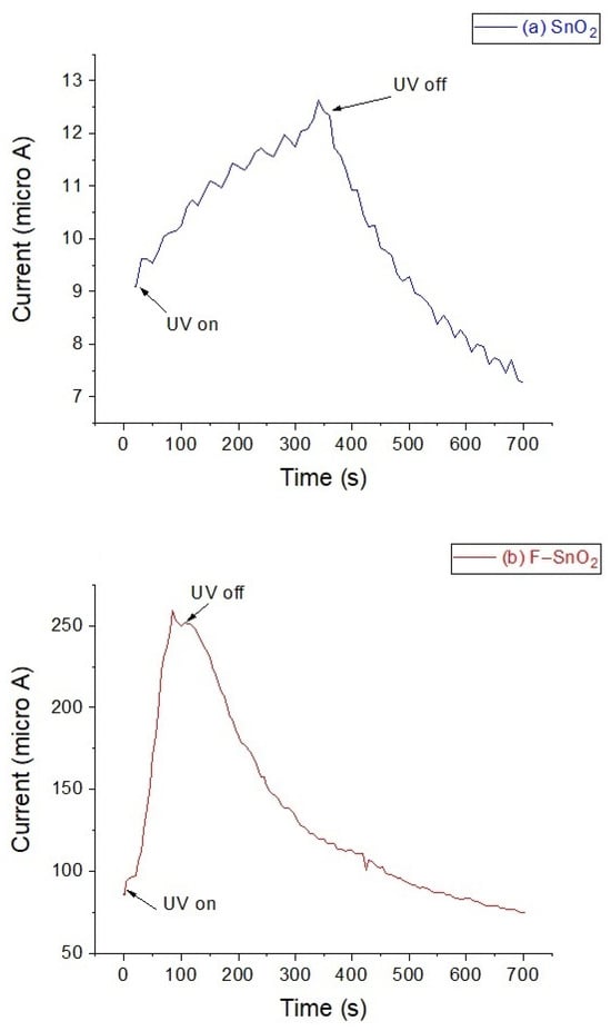 To study the optoelectronic excitation effect of the materials, both samples were subjected to UV light for a few minutes, while the current produced was recorded simultaneously, as presented in Figure 9. This current was a measure of the excited electrons (e−) coming from the valence band hopping to the conduction band for the semiconductor materials []. Initially, SnO2 was exposed to UV light for 5 min, at which point the current increased to a maximum of 12.6 μA. After that, the UV source was switched off and the recorded current continued to decline, as shown in Figure 9a. F–SnO2 was then subjected to the same source for 2 min, and when the UV light was on the current increased sharply from 70 to 259 μA. Next, this source switched off and the current started to decline gradually to the end of the test (Figure 9b). This produced a current that was about 20 times larger than that of SnO2. This test confirmed two points, firstly that both samples can be optically excited under wavelengths at/or below 365 for SnO2 and 392 nm for F–SnO2. Secondly, F–SnO2 is more optically active than SnO2 at similar experimental conditions; this could be the result of having a smaller band gap. This smaller band gap allowed more charges to be excited at this wavelength (365 nm) than in pristine SnO2. This could be the result of having an electron donor fluoride ion in the framework, more charges available, and faster charge transfer because of a more compacted structure.