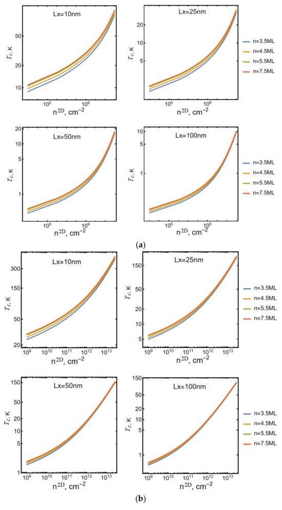 The dependence of the condensation temperature on the value of the two-dimensional particle density at different sizes of the NPL area. (a) Plotted for lower values of exciton density, (b) larger values of density.