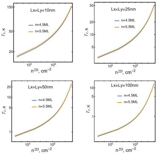The dependence of the condensation temperature on the value of the two-dimensional particle density at different sizes of the NPL area in the case of the presence of free charges and saturated screening. From a comparison of the graphs in Figure 2 and Figure 3, it is clearly seen that in the presence of saturated screening, under otherwise identical conditions, the temperature of the Bose condensation increases.