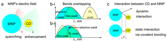 CD and MNP interactions. (a) Schematic representation of the influence of the distance between CD and MNP on quenching/enhancement of the CD’s emission. (b) Excitation regimes: (i) only the absorption (Abs) band is in resonance with the plasmon peak; (ii) both absorption and PL bands are in resonance with plasmon peak of MNP. (c) Interactions of CD and MNP: dynamic by attractive and repulsive forces in colloidal solution; static via covalent bonding of CD to the surface of the MNP.