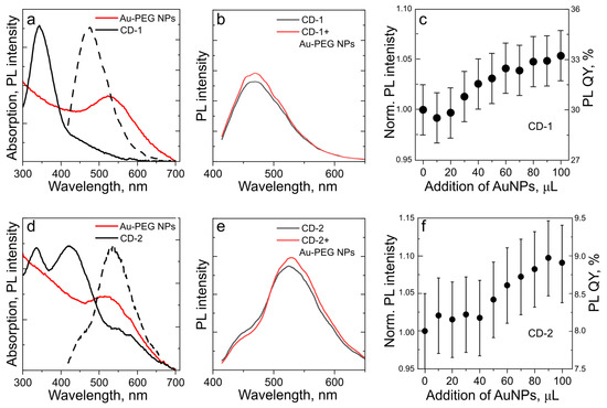 Dynamic interaction of Au-PEG NPs with CD-1 (a–c) and CD-2 (d–f): (a,d) overlapping of absorption (black line) and PL spectra excited at 405 nm (dashed black line) of CDs with absorption of Au-PEG NPs (red line); (b,e) PL spectra excited at 405 nm of CDs without (black line) and with Au-PEG NPs (red line); (c,f) change of the integrated PL intensity of CDs normalized to the intensity of pristine CDs (PL enhancement) and PL QY upon addition of increasing amount of Au-PEG NPs.