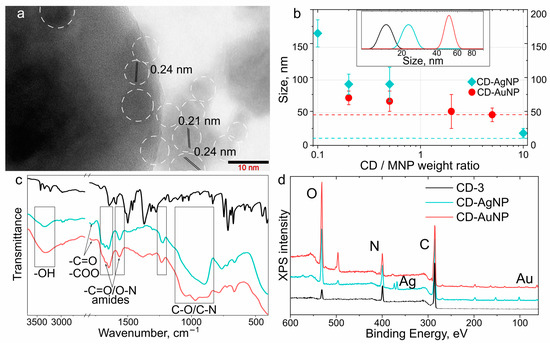 TEM images of the CD–AgNP and CD–AuNP complexes shown in Figure S5 and Figure 4a, respectively, demonstrate the presence of CDs in the close vicinity of MNPs, which manifested themselves as gray spots with interplanar distances of 0.21 and 0.24 nm, characteristic for carbon allotropes [39]. The DLS measurements showed that for CD–AgNP complexes with fewer attached CDs, the complexes tended to form agglomerates 8–10 times larger than AgNPs with an average size up to 165 ± 20 nm (Figure 4b). With an increase in the CD/AgNP weight ratio up to 10, the complexes with sizes of 18 ± 7 nm—only slightly larger than pristine AgNPs—were observed (Figure 4b), indicating that an interparticle distance reached 1–2 CDs in diameter. For the CD–AuNP complexes, a similar trend was observed, but with a smaller agglomerate formation: at the CD/AuNP weight ratio above 2, the size of the CD–AuNP complexes was almost the same as for the pristine AuNPs (Figure 4b). These observations indicated that stable conjugated CD–MNP complexes were preferentially formed at a rather high CD/MNP weight ratio with an interparticle distance of 1–2 CDs in diameter. From the DLS spectra of the CD–MNP complexes shown in Figure S6, there were signals from rather large agglomerates (>100 nm) whose size decreased upon an increase in the CD amount, which confirmed the stabilization of the complexes in solutions with an increase in the CD/MNP weight ratio.