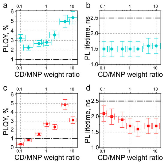 Optical properties of (a,b) CD–AgNP complexes and (c,d) CD–AuNP complexes. PL QY (a,c) and average PL lifetime (b,d) versus CD/MNP weight ratios. Dash-dot lines in (a,c) and (b,d) provide the values of PL QY and PL lifetime for the pristine CD-3, respectively.