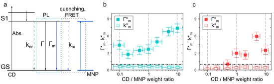 A schematic illustration of the electronic transitions of CDs in the close vicinity of plasmonic MNPs is given in a Jablonski diagram in Figure 6a. For the pristine CD-3, the relaxation of the lowest excited state (S1) can occur both through radiative () and nonradiative () processes with . The estimated and values for CDs are equal to 4.0 × 106 and 3.9 × 108 s−1, respectively. If the CD’s intrinsic radiative decay rate remained unchanged in the CD–MNP complex, the change in PL QY can be attributed to the changes in , or to the plasmon-induced enhancement of . The plasmon-induced radiative recombination rate, , shortened the PL lifetime and affected the PL QY of the fluorophore near the metal surface according to . This enhancement is related to the increase in the PL intensity of the CDs before the non-radiative energy dissipation, and it is more pronounced for fluorophores with low PL QYs [22]. Moreover, one should consider the PL quenching by reabsorption and/or near-field plasmonic dissipation prevailing the radiative relaxation of a fluorophore, and to account for this factor, another nonradiative constant, , should be taken into account when estimating the PL QY of CD–MNP complexes: .