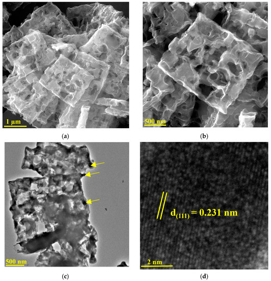 Scanning electron microscopy (SEM) was used to depict the morphological attributes of the Cu/CuxO-PCC-0h at different magnifications. Figure 1a,b shows the rough, porous and amorphous nature of the overlapped and randomly aggregated cuboids. The ultrafast coordination reaction created the porous morphology, which was well maintained after pyrolysis. Measuring the dimensions of different cubes gives an average of 1.72 µm side length and 148 nm thickness (see Figure S1). The HRTEM image in Figure 1c shows two cuboids overlapping with each other. Cu/CuxO nanoparticles that detached from the coordination complex after carbonization remained dispersed in the nitrogenous framework. The Cu/CuxO particles appear as tiny dark dots (indicated in arrows in Figure 1c). Cu/CuxO nanoparticles appear dispersed all over the cubic structure and less dispersed at some parts of the cubes. Agglomeration could be attributed to the weak physisorption of some of the nanoparticles with the carbon matrix, leading them to adhere to each other. Figure 1d shows the lattice fringes of Cu nanoparticles. The spacing of lattice fringes of one direction is found to be 0.231 nm which is close to the d spacing value of the (111) plane of Cu [45]. Cu/CuxO nanoparticle sizes were estimated to be in a 5–30 nm size range (see Figure S2). Larger dark regions on the images represent agglomeration of the Cu/CuxO particles or may appear so due to overlapped Cu/CuxO-containing carbon layers. The high-resolution TEM image in Figure 1e presents one Cu nanoparticle of about 25 nm in size.