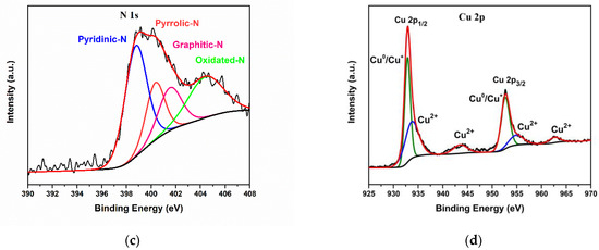 Previous reports have shown a high dependence of catalyst activity on the Cu amount in the catalyst [57]. The presence of higher quantities of pyridinic and graphitic nitrogen species, shown in Figure 11a in the Cu/CuxO-PCC-0h, also worked as a facilitator to CO2 reduction with C-C coupling reaction mainly occurring on the Cu/CuxO active sites. Other reports strongly support the fact that selectivity to C2 products is simultaneously ascribed to the introduction of copper and nitrogen systems on carbon-supported materials.