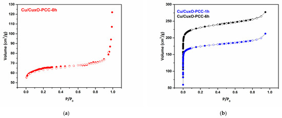 Figure 5. (a) adsorption-desorption isotherm of the unleached PCC catalyst, Cu/CuxO-PCC-0h (b) adsorption-desorption isotherms of the leached PCC catalysts, Cu/CuxO-PCC-1h, Cu/CuxO-PCC-6h.