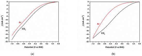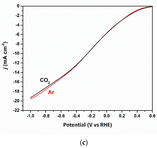 To assess the electrochemical performance of the three catalysts, Linear sweep voltammetry (LSV) measurements were conducted. Figure 7a–c compares the LSV plots of the three catalysts under Argon and CO2 saturated electrolytes. The three catalysts display a monotonic increase in current densities upon increasing the overpotentials. The increased cathodic current density in Ar-saturated electrolytes is most probably attributed to the hydrogen evolution reaction HER. However, for the CO2-saturated media, the increased cathodic current density resulted from both HER and CO2 reduction. In Figure 7a, the higher current densities in CO2-saturated electrolytes indicate more reactivity to CO2 reduction over HER. Starting at 0.4 V vs. RHE, CO2 reduction starts to display higher reactivity over HER.