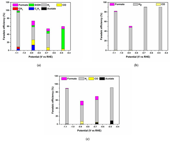 Controlled potential electrolysis experiments were conducted in an H-type cell in a CO2-saturated 0.5 M KHCO3 solution to evaluate Faradaic Efficiencies (Fes) of both gaseous and soluble products. Fes were evaluated at six different potentials starting from −0.1 V up to −1.1 V vs. RHE. At the lowest potential range of −0.1 and −0.3 V, no products were observed for the three catalysts. However, at the potential of −0.5 V vs. RHE, products started to appear in the three catalysts. The onset potential for CO2 reaction is most likely to be in the range of −0.4–0.5 V vs. RHE. Although LSV results suggest lower onset, detectable quantities were only observed at this potential range. For Cu/CuxO-PCC-0h (see Figure 8a), the detected liquid products from H1NMR were acetate, formate, and ethanol, whereas the detected gaseous products were hydrogen, carbon monoxide, methane, and ethylene. This variety in products is commonly observed in Cu-containing catalysts [54].