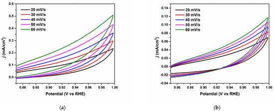 The Cu/CuxO-PCC-0h catalyst displays an extremely low onset potential of about 0.4 V vs. RHE; the increment rate of current density increases after the 0.2 V vs. RHE, then it increases more at −0.2 V, after which the same rate is maintained. Although very small, it is worth mentioning that the reduction peak at 0.45 V vs. RHE can be ascribed to reduced CuO to Cu2O [53]. While the LSV behavior for the Cu/CuxO-PCC-1h catalyst is similar to that of Cu/CuxO-PCC-0h under CO2 saturated electrolyte, argon saturated electrolyte displays different behavior. The gap between both Ar- and CO2-saturated LSVs (see Figure 7b) increases gradually and reaches a maximum at −0.5 V before decreasing until meeting at one point at −1.0 V vs. RHE. The peak at 0.45 V vs. RHE disappears since CuO almost disappeared after leaching, as observed from XRD. Cu/CuxO-PCC-6h catalyst in Figure 7c, however, shows similar behavior in both environments, which can be attributed to the lower quantity of CO2 favoring active sites.
