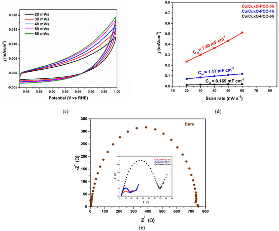 Figure 10. (ac) CV plots electrochemical double-layer measurement electrolytes for Cu/CuxO-PCC-0h, Cu/CuxO-PCC-1h, and Cu/CuxO-PCC-6h, respectively. (d) Electrochemical double layer plot (e) Nyquist plots at −0.5 V vs. RHE.