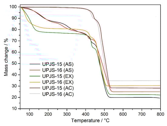 Thermogravimetric curves of as-synthesized (AS), solvent-exchanged (EX), and activated (AC) UPJS-15 and UPJS-16 samples in the air atmosphere.