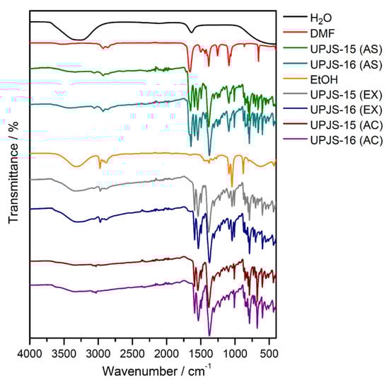 Infrared spectroscopy was applied to confirm the presence of building blocks and solvents (MTA, DMF, and water) in the materials and also to monitor the solvent exchange and activation processes. The IR spectra of compounds are shown in Figure 4, and the assignment of characteristic absorption bands to the bond type vibrations is summarized in Table 1. The isostructurality of the materials is also shown in infrared spectroscopy by the similarity of obtained IR spectra (see Figure 4). The presence of coordinated and crystallization water molecules in as-synthesized UPJS-15 (AS) and UPJS-16 (AS) materials is evident from the broad absorption band about 3400 cm−1, which could be attributed to the stretching ν(OH) vibrations. DMF molecules located in the cavities are evidenced by the stretching vibration of aliphatic ν(CH) vibration in the region 3050–3060 cm−1 and the strong and sharp absorption band of carbonyl groups (ν(C=O)) in the range of 1640–1650 cm−1 for both compounds. The unambiguous presence of the mentioned solvents was confirmed by comparing the IR spectra of water and N,N′-dimethylformamide with the synthesized compounds (see Figure 4). The MTA linker in the compound´s frameworks is evident from the presence of several characteristic absorption bands: aromatic stretching vibrations ν(CH)ar, ν(C=C)ar and carboxylate symmetric and antisymmetric stretching (ν(COO−)s, ν(COO−)as), as well as deformation vibrations (δ(COO-)) (see Figure 4 and Table 1). The successful ethanol exchange process in the IR spectra of UPJS-15 (EX) and UPJS-16 (EX) was confirmed by the absence of the ν(C=O) band, which is characteristic for DMF, and also by the presence of three new aliphatic CH vibrations in the interval 2966–2844 cm−1. All absorption bands typical for MTA were observed in the samples after the solvent exchange process. Figure 4 also shows the IR spectra of activated compounds (AC), which confirm the successful removal of solvents after the activation process due to the absence of characteristic absorption bands for solvents, ethanol, and water (see Table 1).