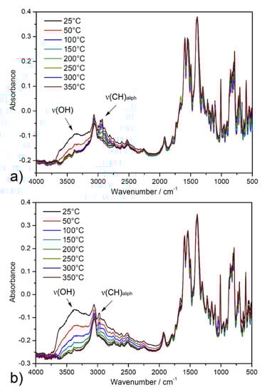 The activation process of ethanol-exchanged samples was also investigated by in situ heating infrared spectroscopy (DRIFT) under a vacuum from ambient temperature up to 350 °C (see Figure 5). A broad band dip around 3400 cm−1 was observed, corresponding to the O-H stretching vibrations (ν(OH)) of crystallization ethanol and coordinated water molecules from the pore system. Moreover, a decreased intensity of the absorption bands under 3000 cm−1 to 2800 cm−1 was observed that corresponds to the stretching vibrations of aliphatic C-H groups (ν(CH)aliph) of the aliphatic system of ethanol. Otherwise, the other bands in the spectrum were without changes, confirming the thermal stability of porous materials during the degassing process under a vacuum. The results of the described study are important, especially in the process of material desolvation that occurs during the activation of materials during adsorption measurements.