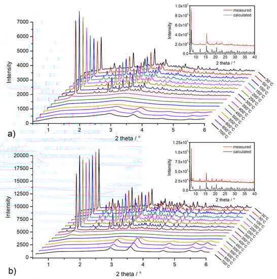 High-energy powder X-ray diffraction (HE-PXRD) measurements at DESY (Hamburg, Germany) were performed to investigate the framework stability/lability of solvent-exchanged materials during in situ heating. Figure 6 shows comparisons of measured diffraction patterns with calculated patterns of the compounds from the results of single-crystal X-ray diffraction analysis (SC-XRD) (see insets in Figure 6a,b) and results of in situ heating HE-PXRD measurements in the temperature range of 30–700 °C with 50 °C steps (see Figure 6a,b). As can be seen from the comparison in insets of Figure 6, the measured and calculated diffraction patterns of the materials are in good agreement, representing the phase purity of the bulks and the stability of the compounds during the solvent exchange process. From the results of in situ HE-PXRD measurements (see Figure 6a,b), it can be stated that the materials show a similar, moderate thermal stability, which is in good agreement with the conclusions of TG experiments (see text above). The compounds are stable in the temperature range of 30–350 °C due to the presence of characteristic diffraction peaks for the compounds without the presence of a phase change. According to Kitagawa´s MOF classification, materials UPJS-15 and UPJS-16 should be included in the second generation, with stable and robust frameworks without the presence of guest molecules in the channels []. Above 350 °C in the temperature range of 400–500 °C, the framework’s collapse is associated with the thermal decomposition of the MTA linker, as only an amorphous phase is present, and no clearly defined diffraction peaks are present in the patterns. In the temperature range of 550–700 °C, the formation of new diffraction peaks can be observed, which correspond to the creation of carbonates of the respective metals as the final decomposition products (see Figure S1 in Supplementary Materials).
