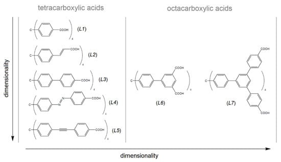 Tetrahedral carboxylate linkers containing tetraphenylmethane core used in the MOF preparation. L1 = methanetetrabenzoic acid, L2 = methanetetracinnamic acid, L3 = 4,4′,4″,4‴-(4,4′,4″,4‴-methanetetrayltetrakis(benzene-4,1-diyl)tetrakis(ethyne-2,1-diyl))tetrabenzoic acid, L4 = 4,4′,4″,4‴-(4,4′,4″,4‴-methanetetrayltetrakis(benzene-4,1-diyl)tetrakis(aza))tetrakis(methan-1-yl-1-yliden)tetrabenzoic acid, L5 = 4,4′,4″,4‴-(4,4′,4″,4‴-methanetetrayltetrakis(benzene-4,1-diyl)tetrakis(ethine))tetrakis(methan-1-yl-1-yliden)tetrabenzoic acid, L6 = 4,4′,4″,4‴-(4,4′,4″,4‴-methanetetrayltetrakis(benzene-4,1-diyl)tetrakis(ethyne-2,1-diyl))isophthalic acid, L7 = f tetrakis{3,5-bis[(4-carboxyl)phenyl]phenyl}methane.