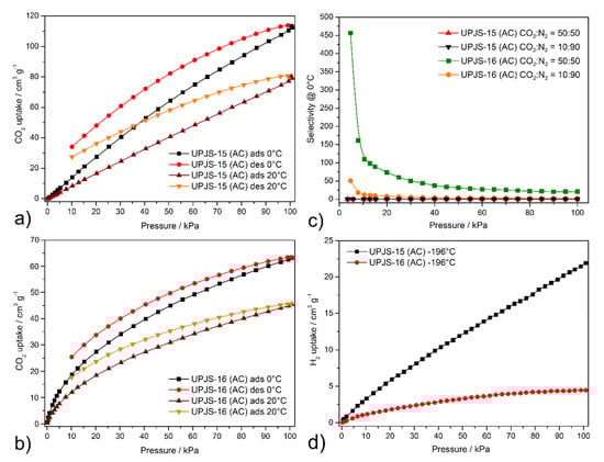 Carbon dioxide adsorption/desorption isotherms of (a) UPJS-15 (AC) and (b) UPJS-16 (AC) measured @ 0 and 20 °C. (c) IAST selectivities predicted between 5 and 100 kPa for equimolar and 10:90 binary gas mixture of CO2/N2 on UPJS-15 (AC) and UPJS-16 (AC) @ 0 °C. (d) Hydrogen adsorption isotherms measured @ −196 °C.