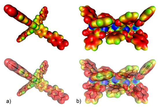 (a) Electron density isosurface (with 1% probability) colour-coded with the electrostatic potential (up) and location of the selected motifs of UPJS-15 therein (down) for (a) MTA linker (the electrostatic colour values are: red < −0.2, yellow = −0.15, green = −0.1, pale blue = −0.05, and blue = 0.00) and (b) strontium(II) cluster (red < −0.10, yellow = −0.05, green = 0.00, pale blue = 0.05, and blue > 0.10).