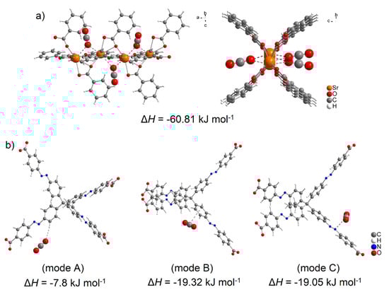 Using DFT calculations, the degree of CO2 interactions with the detected active sites were determined using counterpoint calculations, and obtained results are shown in Figure 11. CO2 with CUSs within the Sr(II) cluster shows the highest adsorption enthalpy with a value of ΔH = −60.81 kJ mol−1 for each carbon dioxide molecule. The calculated positions of CO2 molecules in the cluster in different views are shown in Figure 11a. Within the MTA linker (see Figure 11b), several possible active sites were detected, and the calculated enthalpy values can be arranged as follows: the lowest value of ΔH = −7.80 kJ mol−1 (mode A) was identified when the oxygen atom (δ-) of CO2 interacted with the hydrogen atom of the CH group (δ−), followed by the interactions of the phenyl ring (δ−, mode B) and the azo bond (δ−, mode C) with a carbon atom of CO2 (δ−), whose values are approximately the same, ΔH = 19.32 kJ mol−1 and ΔH = 19.05 kJ mol−1, respectively.