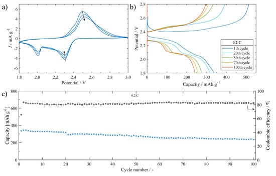 - Capkova, D.; Kazda, T.; Čudek, P.; Strakova Fedorkova, A. Binder Influence on Electrochemical Properties of Li-S Batteries. ECS Trans. 2020, 99, 161–167. [Google Scholar] [CrossRef]