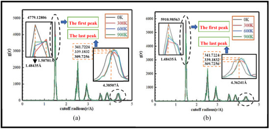 Regarding 3C-SiC in (010) crystal plane different temperatures between the C-Si atom radial distribution function, as shown in Figure 2, which can be seen from Figure 2, temperature on the radial distribution function of the overall influence is not very large; the aggregation state region of the atom is more concentrated. In Figure 2a, when the indentation depth is 2 nm, the first and last peaks are reached at the truncation radius r = 1.48435 A and r = 4.38507 A, respectively. The maximum value of g(r) is reached at the low temperature of 0 K, corresponding to 4779.12806 and 339.1832. The correlations between particles from strong to weak are 900 K, 600 K and 300 K. As shown in Figure 2b, the indentation depth is 10 nm; the first and last peaks are first reached at the truncation radius r = 1.48435 A and r = 4.36241 A, respectively, which is the same as the law when the indentation depth is 2 nm, and the two peaks are the largest at 0 K low temperature g(r), corresponding to the peaks of 5910.98563 and 339.1832, and the correlation between particles is 900 K > 600 K > 300 K. The radial distribution function under the depth of 2 nm and 10 nm indentation was showing a downward trend, and the probability of atomic distribution at the truncation radius of 1.48435 A is the highest, while the corresponding peak g(r) of 10 nm is significantly greater than the corresponding peak of 2 nm, and the truncation radius of 10 nm to reach the last peak is slightly less than the truncation radius of 2 nm to reach the last peak, but the difference between the corresponding peaks at the two indentations is relatively small, which indicates that the depth of the indentation increases. The covalent bond between atoms around the contact area with the indenter is fractured and reconstructed jointly, and the motion of the atomic sequence changes. In summary, the influence of temperature on the radial distribution function of the 3C-SiC nanoindentation is not significant in general, and the change trend in the radial distribution function of different indentation depths is basically the same under the conditions of low temperature, room temperature, medium-high temperature and high temperature, and the radial distribution relationship of atoms under temperature conditions of 900 K and 600 K fluctuates between 0 K and 300 K temperatures, and the relationship between high temperature, medium and high temperature and radial distribution curves at room temperature coincides in general. In the 0 K low temperature environment, the motion between particles is gentle, and the covalent bond between atoms exists stably and acts steadily, which can maintain the close connection state of the atoms and make the C-Si atoms show a high aggregation state. The temperature increase from 0 K to 900 K has little effect on 3C-SiC materials, and to a certain extent, it is verified that 3C-Si materials have high-temperature resistance characteristics.