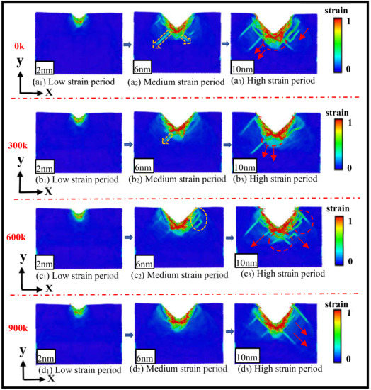 In this paper, the strain state of three-dimensional silicon carbide materials during nanoindentation loading at different temperatures was studied, and the damage of 3C-SiC under different temperatures was investigated. As shown in Figure 3, it is a strain cloud map of different temperatures and different indentation processes in the x0y-plane; the strain region corresponding to the color from blue to red is from the high strain zone to the low strain region, and the nanoindentation simulation temperatures 0 K, 300 K, 600 K and 900 K correspond to the Figure 3a–d, respectively. When the depth of the nanoindentation is 2 nm, compared with the graphs (a1), (b1), (c1) and (d1), the depth strain is not significantly different at different temperatures, and only shows low strain, and the degree of deformation of the matrix is small under this indentation depth. In Figure 3a2–d2, when the indentation depth is 6 nm, the contact area between the indenter and the 3C-SiC matrix shows a high strain zone with a different area due to the different temperature. The area of the high strain area is the largest at 600 K, indicating that the indentation surface deformation degree is the most significant at medium and high temperatures. The second area is from large to small 900 K, 300 K, 0 K. At 900 K, the strain is distributed in a clustered state; the stress action at 0 K, 300 K and 600 K is different; the strain spreads or expands in different directions and degrees. At 0 K, a large number of atoms slip in the negative direction of the x0y-plane, resulting in a long dislocation. At 300 K, 3C-SiC is stressed to reach the critical strength of dislocation germination. At the initial expansion trend at 600 K, in the positive direction of the x0y-plane, active ring dislocation extends downward along the negative direction of the y-axis. When the indentation depth reaches a maximum depth of 10 nm, the high strain zone expands in different ways at different temperatures compared to the comparison plots (a3), (b3), (c3) and (d3). At 0 K, three longer dislocations are derived at the mirror image in the negative direction of the x0y-plane. The extension trend is obvious and continuous. The 300 K and 600 K high strain regions are expanded with filler and point-fill limitations, respectively. The 300 K original dislocation continues to grow in the original direction while deriving new dislocations along 1/2[−110]; the 600 K strain is significantly extended by a different stress range and strength, but not continuous; the 900 K stress concentration, high strain region expansion is significant, but the degree of ductility is not significant, and the impact on internal damage is small. In summary, temperature has an effect on the damage state of the 3C-SiC matrix during nanoindentation loading. At different temperatures, there are differences in the strength, expansion direction and type of stress; the external characterization of strain is centered on the indenter contact area, and the tendency of extension occurs in different ways. Continuous and obvious extension occurs at a low temperatures; three long dislocations are derived in the negative direction and mirror image of the x0y-plane; a small number of ring dislocations and short dislocations are generated at the bottom of the indentation. The medium and high temperature strain is extended in a dispersed short section; there are cross-dislocations, discrete dislocations and centralized ring dislocations at the same time; compared with the limited effect of normal-temperature and high-temperature stress, the strain extension trend is not obvious; low, medium and high temperature have a significant impact on the internal damage of the matrix.